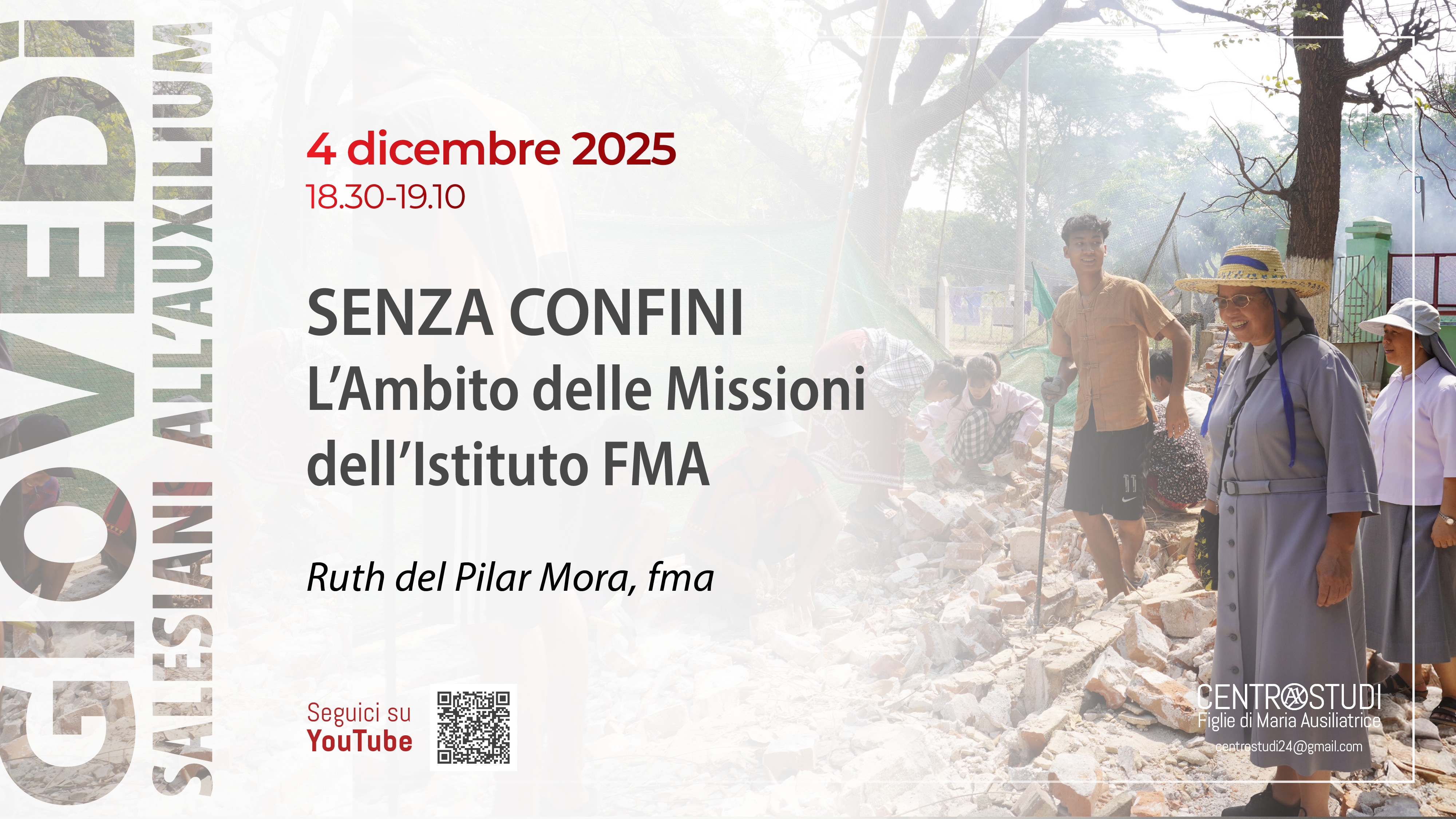 È fissato per giovedì 4 dicembre, come di consueto alle 18.30, in diretta streaming, il secondo appuntamento dei «Giovedì salesiani all’Auxilium», organizzato dal Centro Studi sulle FMA in collaborazione con l’Ambito per le Missioni dell’Istituto FMA.